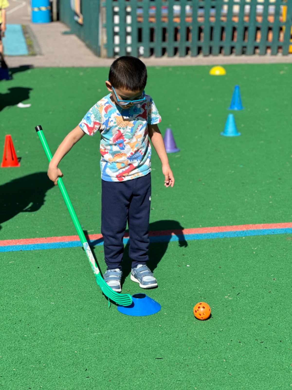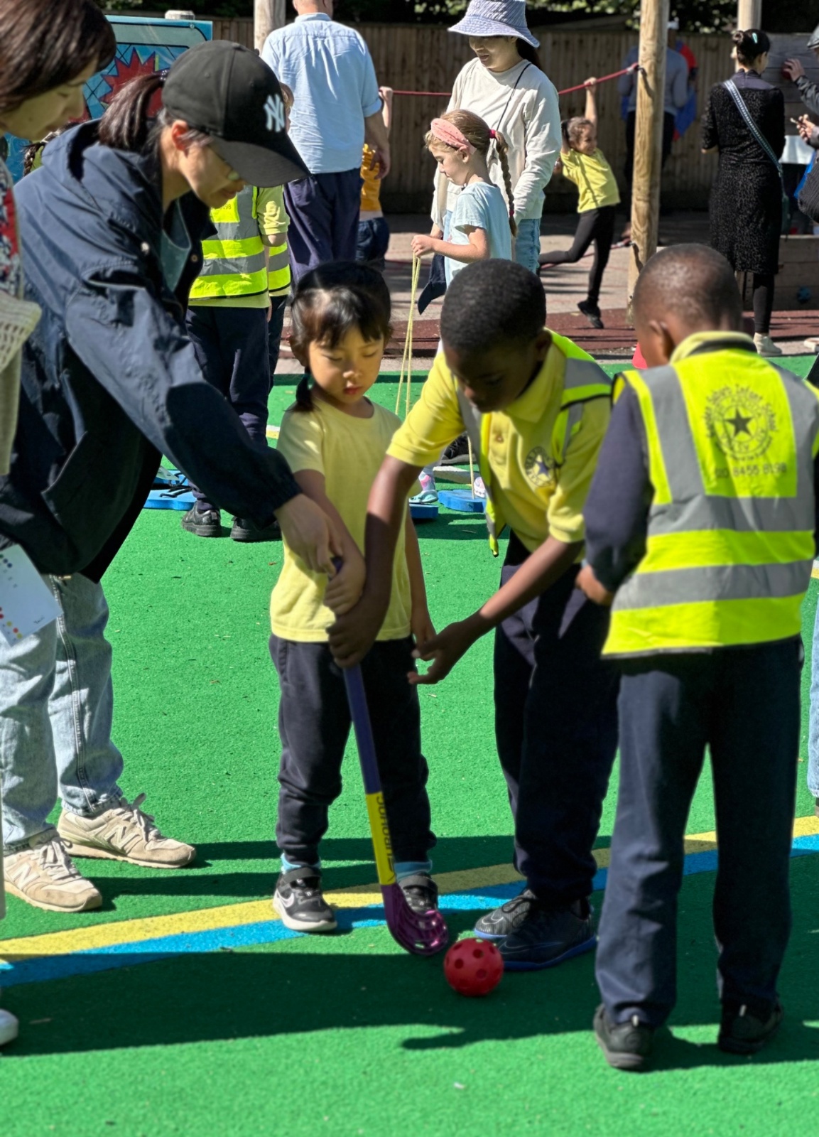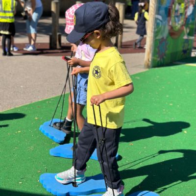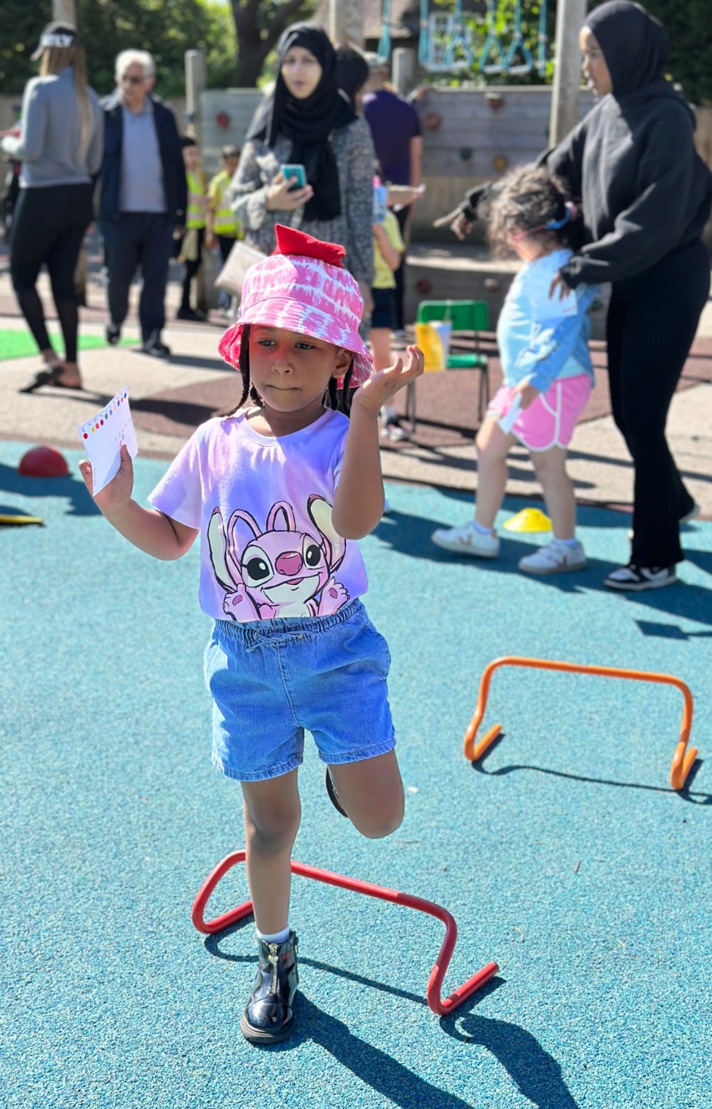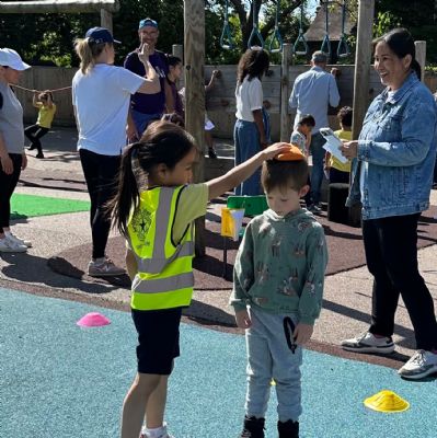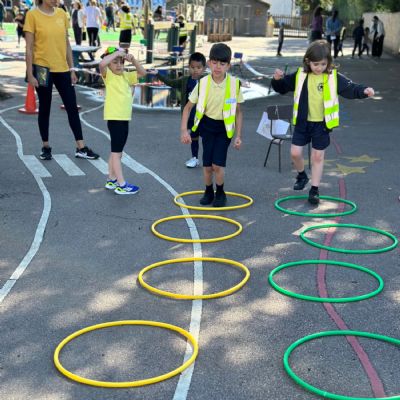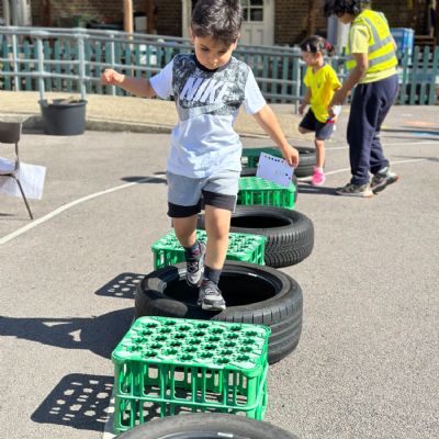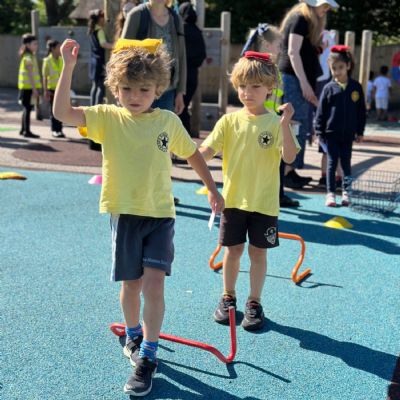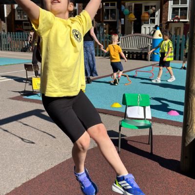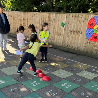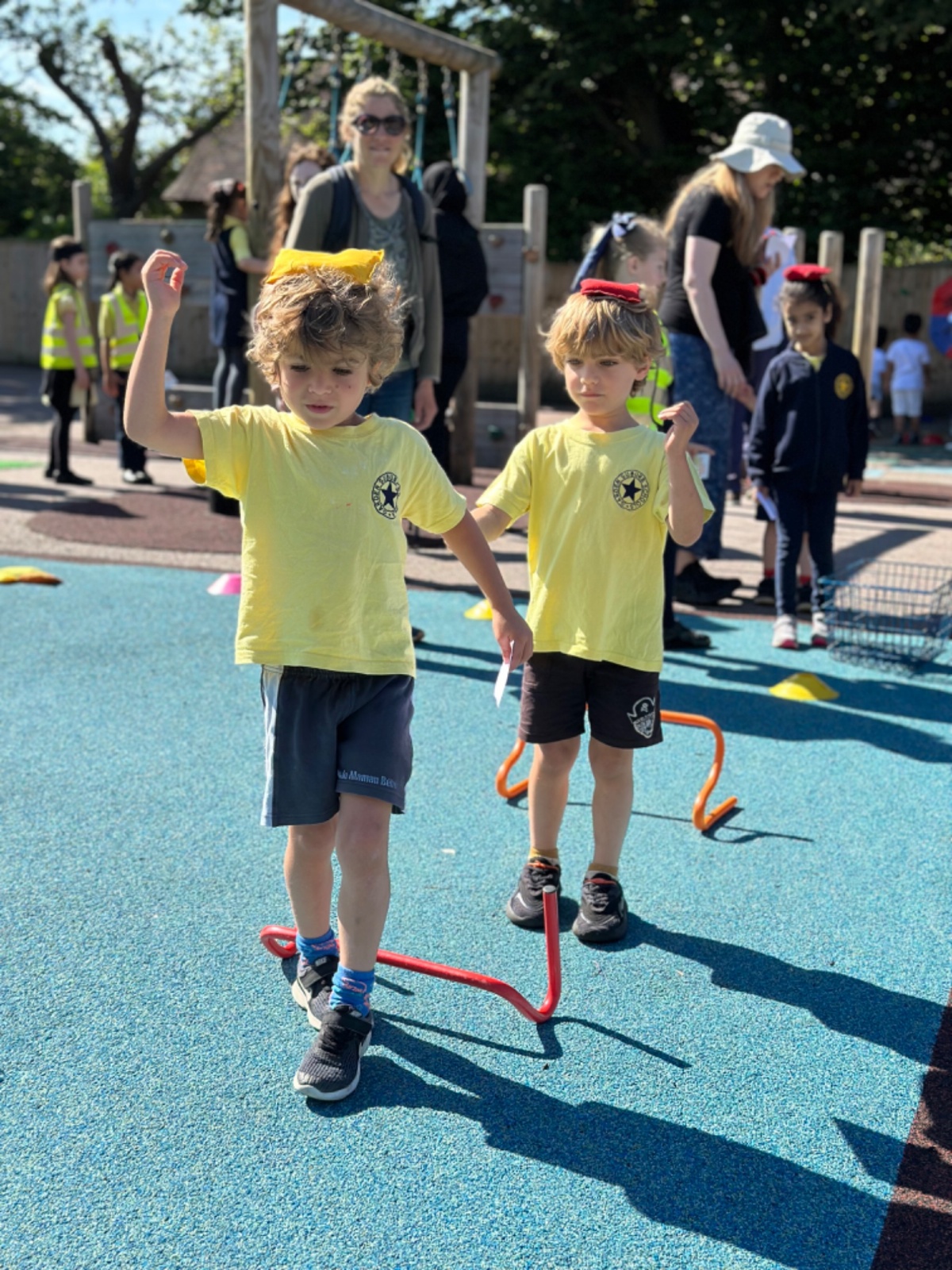 What a fun morning we had! The reception children took part in 15 different physical challenges, including aiming beanbags at a target; walking on stilts; dribbling a ball with a hockey stick; climbing; balancing; swinging on the monkey bars ... and many more!